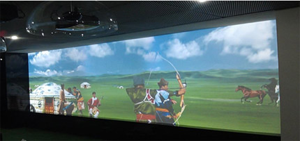 蔚藍的天空與碧草遙相呼應,馬頭琴悠揚響起,牧民騎著高頭大馬彎弓射箭,一群身穿傳統服飾的頑童在相互追逐、嬉戲。這樣的場景我要是告訴您是在博物館內,您相信嗎!