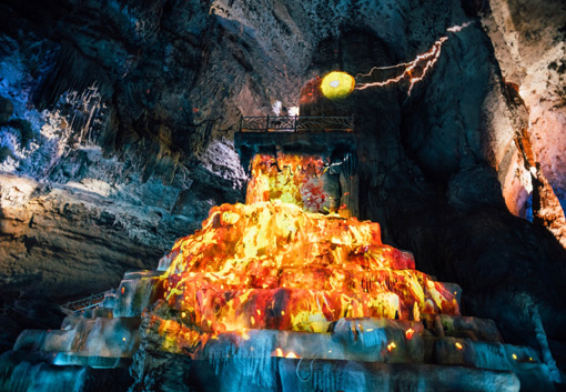 這部世界首幕溶洞實(shí)景光影劇《九天玄女》以溶洞九個(gè)大廳九個(gè)天窗為背景,用現(xiàn)代光影技術(shù)全新演繹九天玄女與張家界九重愿的故事,一舉打破印象劇舞臺(tái)固定、觀眾席固定、演員陣容龐大的傳統(tǒng)模式,以幾個(gè)天窗的溶洞為背景,將舞臺(tái)固定,使觀眾流動(dòng)觀看,讓游客在游覽的過程中完成九幕大劇的完美體驗(yàn)。