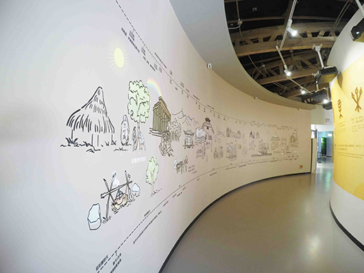 走進樂果展廊,游客們即被“果樹栽培歷史互動墻”吸引;⌒螇γ嫔侠L制簡約風趣的圖案,仔細一瞧原來是人類栽種果樹的歷史重大事件。當游人走近輕撫畫面,驚喜出現,墻上的圖畫一下子變得五彩斑斕,動態效果讓人眼前一亮,絢麗的彩虹、噴氣的煙囪、還有科研創新的靈感閃光,