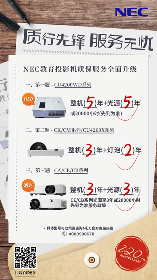 為了給用戶提供更完善的售后服務(wù),免去用戶后顧之憂,2019年在產(chǎn)品技術(shù)升級、創(chuàng)新驅(qū)動下,NEC再次提升了教育市場的“售后維!背兄Z,全面升級各系產(chǎn)品質(zhì)保時長,刷新行業(yè)紀(jì)錄。
